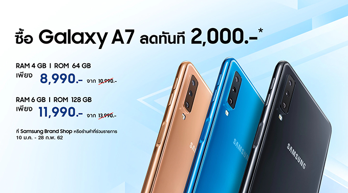 Galaxy Super Deal มอบข้อเสนอสุดพิเศษสำหรับ Samsung Galaxy A7 กล้องหลัง 3 ตัวพร้อมเลนส์ Ultra Wide รับส่วนลดทันที 2,000 บาท รุ่น 64GB เหลือเพียง 8,990 บาท จากราคาปกติ 10,990 และรุ่น 128GB เหลือเพียง 11,990 บาท จากราคาปกติ 13,990 บาท