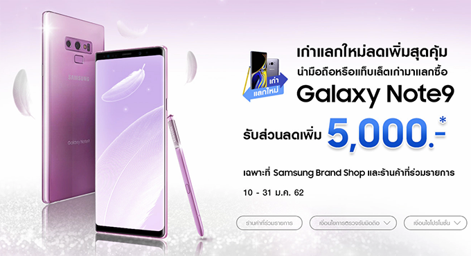 ซัมซุง ใจดีผ่อนให้ฟรี 2 เดือน! สำหรับ Samsung Galaxy Note9 สุดยอดสมาร์ทโฟนทรงพลังสุดพรีเมี่ยม โดยรับเครดิตเงินคืนมูลค่า 6,780 บาท เมื่อชำระด้วยบัตรเครดิตธนาคารที่ร่วมรายการพร้อมใช้สิทธิ์ผ่อน 0% นาน 10 เดือน หรือเลือกรับส่วนลดสูงสุด 5,000 บาท เมื่อนำเครื่องเก่ามาแลกเครื่องใหม่ จากราคาปกติ 33,900 บาท