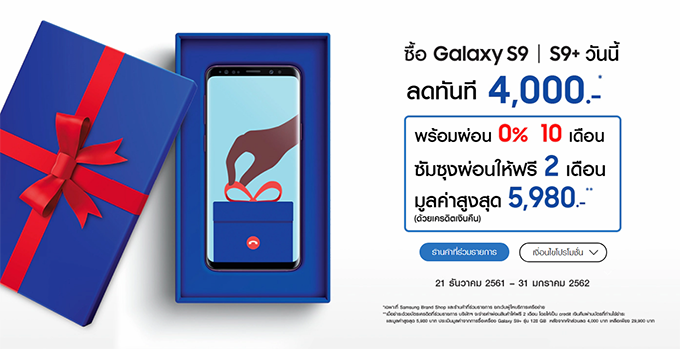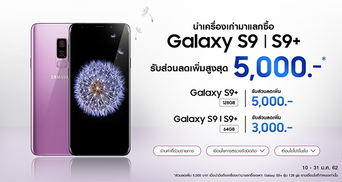 โปรโมชันแรงกระแทกใจสุด ๆ สำหรับสมาร์ทโฟนรุ่นแฟลกชิปอย่าง Samsung Galaxy S9 และ Samsung Galaxy S9+ ลดทันที 4,000 บาท และสามารถรับส่วนลดเพิ่มอีก 5,000 บาท เมื่อนำเครื่องเก่ามาแลกเครื่องใหม่ (เฉพาะรุ่น S9+ 128GB) รวมมูลค่าสูงสุดถึง 9,000 บาท หรือเลือกรับส่วนลดทันที 4,000 บาท พร้อมใช้สิทธิ์ซัมซุงผ่อนให้ฟรี 2 เดือน โดยรับเครดิตเงินคืนเมื่อชำระด้วยบัตรเครดิตธนาคารที่ร่วมรายการพร้อมใช้สิทธิ์ผ่อน 0% นาน 10 เดือน