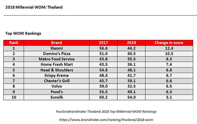 สามารถเข้าชมผลสำรวจการจัดลำดับแบรนด์ที่มิลเลนเนียลไทยพูดถึงมากที่สุดประจำปี 2018 (YouGov BrandIndex Thailand 2018 Millennial WOM Rankings) เต็มรูปแบบได้ที่