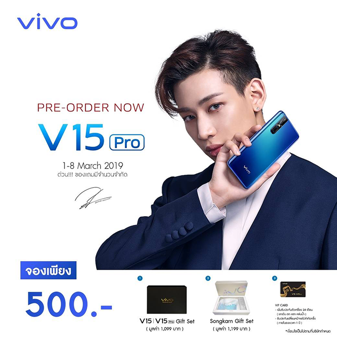 - สำหรับผู้ที่ทำการจอง Vivo V15 Pro สามารถรับเครื่องพร้อมของแถมได้ในวันที่ 9 มีนาคม 2562 เป็นต้นไป