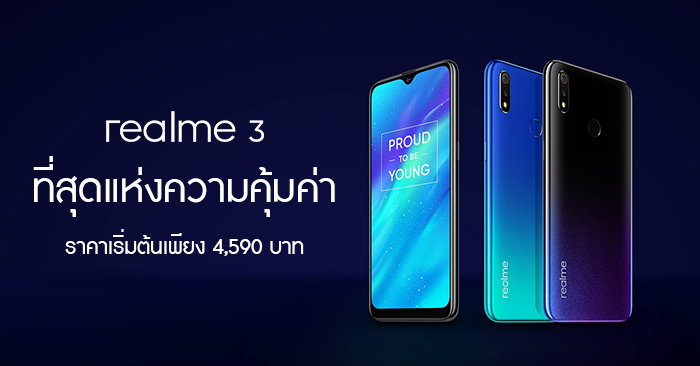 - Realme 3 สี Dynamic Black และ Radiant Blue รุ่นความจุ RAM 3GB/ROM 32GB จำหน่ายผ่านทาง Lazada ราคา 4,590 บาท โดยจะเริ่มรับ Pre-Order วันที่ 27 มีนาคม 2562 พิเศษสุดๆราคาเพียง 4,290 บาทเท่านั้น!