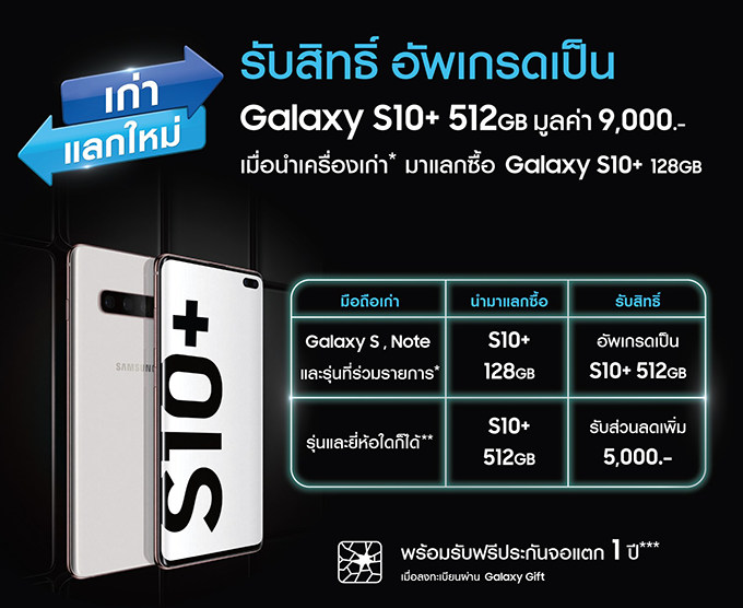ซัมซุง ได้ส่งโปรโมชั่นสุดพิเศษมาเอาใจพร้อมคืนกำไรให้แก่ผู้บริโภคแบบจัดเต็ม โดยสำหรับโปรโมชั่น "เก่าแลกใหม่" ลูกค้าสามารถนำ Galaxy S หรือ Galaxy Note และสมาร์ทโฟนรุ่นอื่นๆ ที่ร่วมรายการเครื่องเก่ามาแลกเป็นส่วนลดซื้อ Galaxy S10+ รุ่นความจุ 128GB พร้อมรับสิทธิ์อัพเกรดเป็นความจุ 512GB ทันที (มูลค่า 9,000 บาท) ที่ SAMSUNG Brand Shop ที่ร่วมรายการ ตั้งแต่วันที่ 8 - 31 มีนาคม 2562 หรือตรวจสอบรายละเอียดโปรโมชั่น และตรวจสอบรุ่นที่ร่วมรายการเพิ่มเติมได้ที่