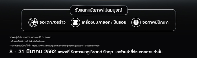 www.samsung.com/th/offer/tradein Samsung Galaxy S10 มาพร้อมหน้าจอไร้ขอบ Infinity-O จัดเต็มด้วยเลนส์ระดับโปรสูงสุดถึง 5 ตัว สามารถถ่ายวิดีโอกล้องหน้าและกล้องหลังได้คมชัดระดับ 4K พร้อมระบบกันสั่นอัจฉริยะ Super Steady สำหรับกล้องหลัง ตอบโจทย์ทุกไลฟ์สไตล์คนรุ่นใหม่ได้อย่างสมบูรณ์แบบ โดยเริ่มวางจำหน่ายอย่างเป็นทางการในประเทศไทยตั้งแต่วันที่ 8 มีนาคม 2562 เป็นต้นไป ในราคาดังต่อไปนี้