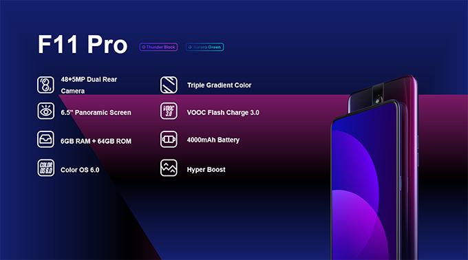 OPPO F11 Pro มาพร้อมกล้องหลังคู่ 48 + 5 ล้านพิกเซล และหน้าจอไร้ติ่งแบบ Panoramic Screen ที่กว้างถึง 6.5 นิ้ว สวยงามโดดเด่นในแบบที่แตกต่าง มีให้เลือก 2 สีคือ Thunder Black และ Aurora Green ชาร์จไวยิ่งขึ้นด้วย VOOC Flash Charge 3.0 ชาร์จไวยิ่งกว่าเดิม 20% มาพร้อมกับแบตเตอร์รี่ขนาด 4,000 mAh ใช้งานได้ลื่นยิ่งขึ้นด้วย Hyper Boost จุใจด้วย RAM 6GB และ ROM 64GB