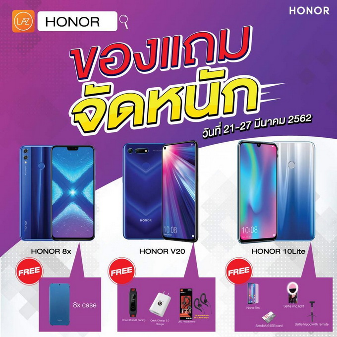 HONOR เอาใจขาช้อปยกขบวนสมาร์ทโฟนหลากหลายรุ่นมาจัดโปรโมชั่นสุดคุ้ม ลด แลก แจก แถม ร่วมฉลองวันเกิดครบรอบ 7 ปี ลาซาด้า ตั้งแต่วันที่ 21 มีนาคม - 27 มีนาคม 2562 นี้เท่านั้น พลาดไม่ได้กับโปรโมชั่นรุ่นไฮไลท์สุดพิเศษจากออเนอร์ อาทิ HONOR 10 Lite สมาร์ทโฟนเพื่อคนรักการเซลฟี่ HONOR 8X เต็มอิ่มกับความบันเทิงอย่างเต็มรูปแบบ หรือ HONOR View 20 สมาร์ทโฟนรุ่นใหม่ล่าสุดที่มีดีไซน์สุดล้ำพร้อมกล้องหลัง 48 ล้านพิกเซล และรุ่นอื่นๆ ที่ร่วมรายการอีกมากมาย
