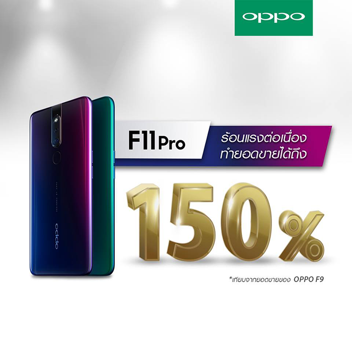 ซึ่ง OPPO F11 Pro ได้รับเสียงตอบรับดีเกินคาด โดยสามารถทำยอดขายได้ถึง 150% ของ OPPO F9 และยังเป็นสมาร์ทโฟนที่ขายดีเป็นอันดับ 1 ต่อเนื่อง 3 วันในตลาดสมาร์ทโฟนที่มีช่วงราคา 10,000 - 15,000 บาท โดยนับตั้งแต่วันแรกที่เปิดขาย คือ 28 มีนาคม 2562 ที่ผ่านมา