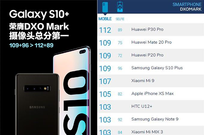 ซึ่งในภาพโปรโมทชุดใหม่ของซัมซุง นอกจากข้อความดังกล่าวแล้ว ยังใส่ตัวเลขคะแนนกล้องจาก DxOMark ไว้ว่า "109+96 > 112+89" โดยตัวเลขดังกล่าวคือ คะแนนรวมของกล้องถ่ายรูประหว่าง Galaxy S10 Plus และ Huawei P30 Pro ที่ทาง DxOMark ให้คะแนนฝั่งของ Galaxy S10 Plus ไว้ที่ 109 คะแนน และอีก 96 คะแนน เป็นคะแนนกล้องหน้าเรื่องของการถ่ายภาพเซลฟี่ ในขณะที่ทางด้าน Huawei P30 Pro ได้คะแนนกล้องหลังรวมอยู่ที่ 112 คะแนน ส่วนกล้องหน้าได้ไป 89 คะแนน เท่านั้น