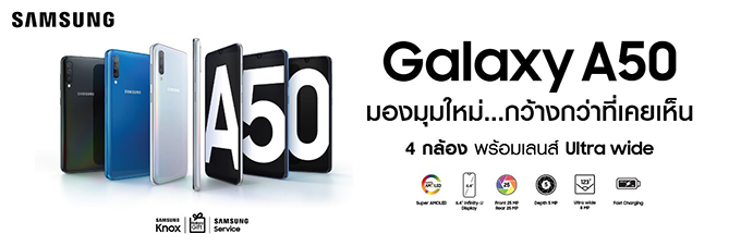 www.facebook.com/SamsungThailand Samsung Galaxy A50 สมาร์ทโฟนที่ออกแบบมาให้คนรุ่นใหม่สนุกสนานกับการถ่ายภาพและวิดีโอมากยิ่งขึ้น ด้วย 3 กล้องหลัง 1 กล้องหน้า ที่มีความละเอียดถึง 25 ล้านพิกเซล เก็บภาพสวยคมชัดทั้งกลางแจ้งและในที่ ๆ แสงน้อย พร้อมเพิ่มความพิเศษด้วยเลนส์ Ultra Wide ถ่ายภาพมุมกว้างได้มากถึง 123 องศา เสมือนกล้องมืออาชีพ ให้พร้อมออกไปเก็บภาพความประทับใจ เปิดมุมมองใหม่ให้กว้างมากยิ่งขึ้น บนหน้าจอ Full HD+ ความละเอียดสูง Super AMOLED ดีไซน์ใหม่แบบ Infinity-U ขนาด 6.4 นิ้ว และเต็มที่กับทุกกิจกรรมตลอดทั้งวัน ด้วยแบตเตอรี่ความจุ 4,000 มิลลิแอมป์ ที่รองรับการชาร์จเร็ว ให้ผู้ใช้งานเชื่อมต่อได้ตลอดเวลา สมกับที่เป็นสมาร์ทโฟนเพื่อการใช้ชีวิตของคนเจเนอเรชั่น Z อย่างแท้จริง