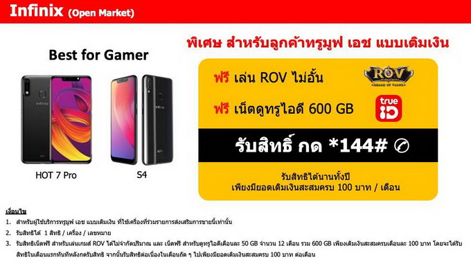 พิเศษผู้ใช้ซิมเติมเงินของ TrueMove H กด *144# แล้วโทรออก พิเศษ ฟรีเน็ตสำหรับเล่นเกม ROV แบบอันลิมิเต็ดจากทรูมูฟเอช และสามารถรับบริการดูรายการดี ภาพยนตร์ดัง ผ่านแอพ True ID สูงสุดถึง 600GB