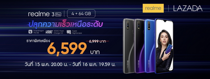 โปรโมชั่นพิเศษสำหรับผู้ที่จับจอง realme 3 Pro ผ่านทางลาซาด้า ในวันที่ 15 พฤษภาคม ตั้งแต่เวลา 20.00 น. จนถึงเวลา 19.59 น. ของวันที่ 16 พฤษภาคมนี้ กับรุ่น 4+64GB ในราคาเพียงแค่ 6599 บาท (จากปกติ 6999 บาท)