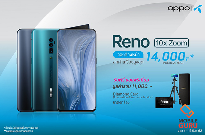 ลูกค้าทรูมูฟ เอช ที่จอง OPPO Reno 10x Zoom เท่านั้น! รับ Diamond Card ประกันหน้าจอแตก 1 ปี พร้อมขาตั้งกล้อง Tripod สุดพรีเมี่ยม รวมมูลค่า 11,000 บาท เมื่อซื้อเครื่อง OPPO Reno 10x Zoom พร้อมสมัครแพ็กเกจ รับ 500 ทรูพอยท์ (ปกติทุก 100 บาท รับ 1 ทรูพอยท์) ลูกค้าที่สนใจสามารถจองได้ตั้งแต่วันนี้ - 13 มิถุนายน 2562 และรับเครื่องได้ตั้งแต่ 15 - 18 มิถุนายน 2562 ที่ทรูช้อป, OPPO Brand Shop และตัวแทนจำหน่ายที่ร่วมรายการ