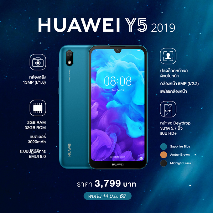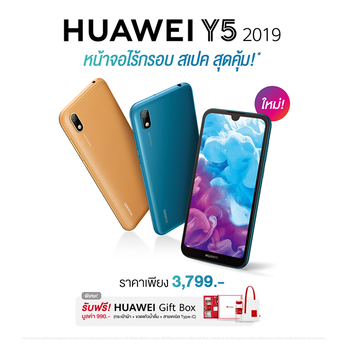 HUAWEI Y5 2019 สมาร์ทโฟนน้องเล็ก สเปคสุดคุ้ม จัดหนักจัดเต็มทั้งจอ กล้อง รวมถึงฟังก์ชั่นต่าง ๆ เพียบ ในราคาเพียง 3,799 บาท พร้อมจำหน่ายทั่วประเทศ ตั้งแต่วันที่ 14 มิถุนายน 2562 เป็นต้นไป ในราคาเพียง 3,799 บาท พร้อมรับของแถมสุดพิเศษ HUAWEI Gift Box มูลค่า 990 บาท