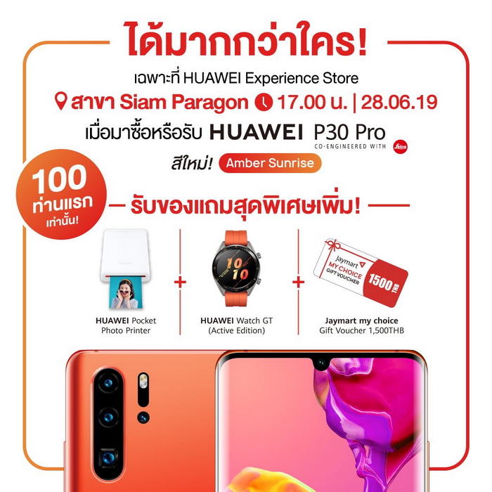 Huawei P30 Pro สีใหม่ Amber Sunrise (ความจุ 512GB) ตอกย้ำความฮ็อตของสีส้มอำพันดุจตะวันเริ่มฉายแสงยามเช้า แรงบันดาลใจในเสน่ห์อันบริสุทธิ์ของธรรมชาติ บนสมาร์ทโฟนที่ปฏิวัติวงการถ่ายภาพ พร้อมมอบประสบการณ์การใช้งานอันยอดเยี่ยม ทั้งยังเปี่ยมไปด้วยสไตล์ที่สะท้อนตัวตนของผู้ใช้อย่างเหนือชั้น พิเศษสุดๆเพียง 100 ท่านแรกเท่านั้น (ทั้งผู้สั่งจองล่วงหน้าและวอล์คอินมาที่ร้านโดยไม่ได้สั่งจอง) ที่ชำระเงินซื้อ Huawei P30 Pro Limited Edition สี Amber Sunrise ณ Huawei Experience Store สาขา Siam Paragon ในวันศุกร์ที่ 28 มิถุนายน 2562 เวลา 17.00 ไม่ต้องลุ้น! รับเลยทันที ของสมนาคุณสุดคุ้มมากมายรวมมูลค่า 11,180 บาท ได้แก่