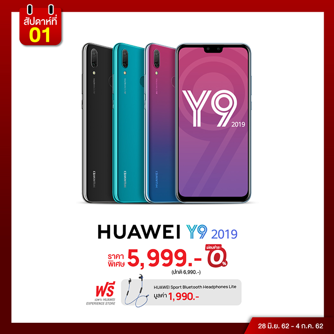 - HUAWEI Y9 2019 สมาร์ทโฟนสเปคล้น เล่นเกมลื่น กับความบันเทิงแบบจัดเต็ม มาพร้อมราคาเบาๆ เพียง 5,999 เท่านั้น! พร้อมรับฟรี! HUAWEI Sport Bluetooth Headphones Lite มูลค่า 1,990 บาท