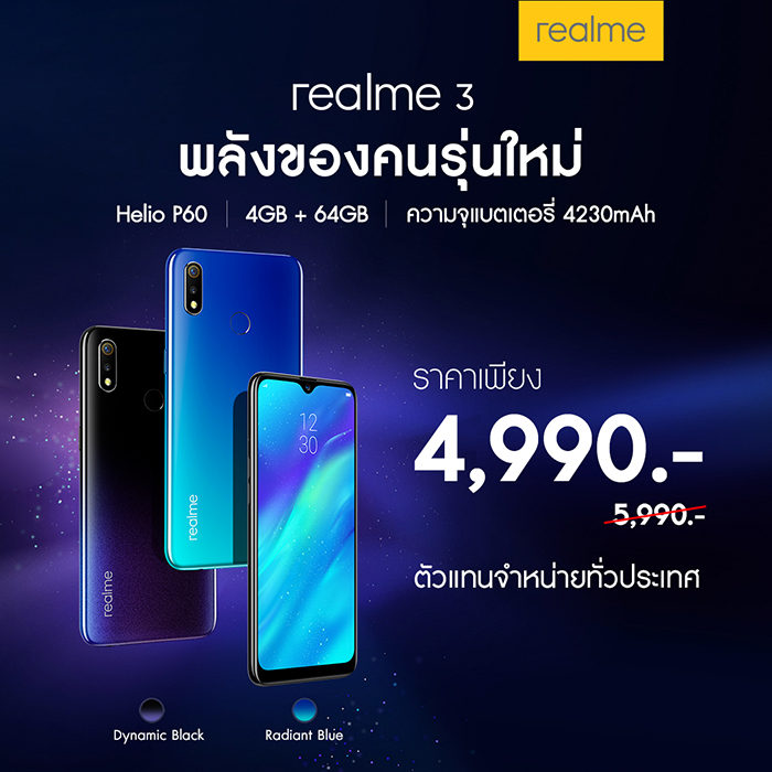 การปรับราคาจะมีผลตั้งแต่ 27 กรกฎาคม 2562 เป็นต้นไป สำหรับ realme 3 รุ่นความจุ 4 GB + 64 GB เหลือเพียง 4,900 บาท (จากราคาปกติ 5,990 บาท) มีให้เลือก 2 สี ได้แก่ Dynamic Black และ Radiant Blue วางจำหน่ายที่ Banana, BKK Tablet Smartphone, CYBORG KONG, KINGKONG PHONE, TEAM Tablet Smartphone, MAXLINK, IBIZ, CSC และตัวแทนจำหน่ายทั่วประเทศ