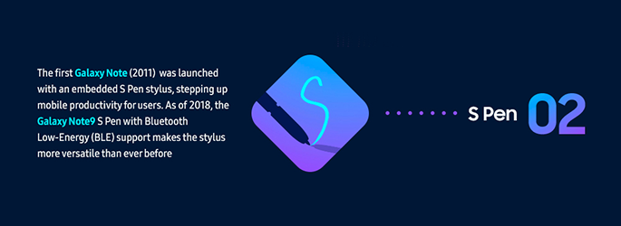 ตั้งแต่ Galaxy Note เครื่องแรกถูกเปิดตัวในปี 2011 พร้อมกับปากกาอัจฉริยะ S Pen ก็สามารถเพิ่มขีดจำกัดความสามารถของผู้ใช้ให้กว้างมากขึ้น และในปีที่ผ่านมา S Pen ใน Samsung Galaxy Note 9 มาพร้อมกับฟังก์ชั่นใหม่อย่างการเชื่อมต่อบลูทูธด้วยเทคโนโลยีเชื่อมต่อที่กินพลังงานน้อย เพื่อสนับสนุนการสร้างสรรค์ผลงานในอีกหลายแง่มุมอย่างไม่เคยมีมาก่อน