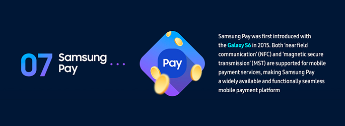 นวัตกรรมชำระเงินด้วยสมาร์ทโฟนรูปแบบใหม่ เปิดตัวครั้งแรกในปี 2015 บน Galaxy S6 เป็นบริการที่ปลอดภัยและมอบความสะดวกสบายให้กับผู้ใช้ ซึ่งรองรับทั้งเทคโนโลยี NFC และ MST ทำให้ Samsung Pay กลายเป็นแพลตฟอร์มการชำระเงินบนสมาร์ทโฟนได้อย่างเต็มรูปแบบ