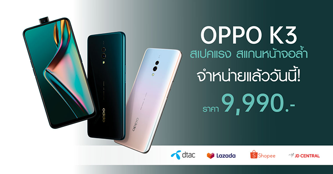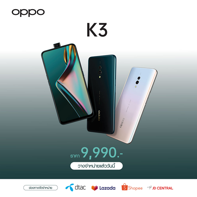 หลังจาก ออปโป้ เปิดให้พรีออเดอร์ OPPO K3 สมาร์ทโฟนที่มาพร้อมกับสโลแกน "สเปคแรง สแกนหน้าจอล้ำ" ก็ได้รับกระแสตอบรับดีเกินคาด และล่าสุดได้วางจำหน่ายอย่างเป็นทางการเรียบร้อยแล้วตั้งแต่วันที่ 8 สิงหาคม 2562 ที่ผ่านมา