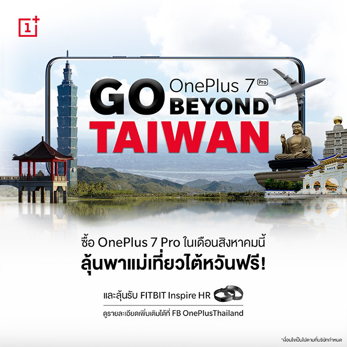 OnePlus ประเทศไทยอย่าง AIS, JD Central และ Lazada ภายในเดือนสิงหาคม 2562 ก็มีสิทธิ์ลุ้นรับตั๋วเครื่องบินไปกลับ กรุงเทพฯ - ไทเป ประเทศไต้หวัน ฟรี!! 1 รางวัล 2 ที่นั่ง รวมมูลค่า 20,000 บาท เท่านั้นยังไม่พอ ยังมีโอกาสลุ้นรับสมาร์ทวอทช์อัจฉริยะอย่าง FITBIT Inspire HR จำนวน 2 รางวัล มูลค่ารางวัลละ 3,790 บาท