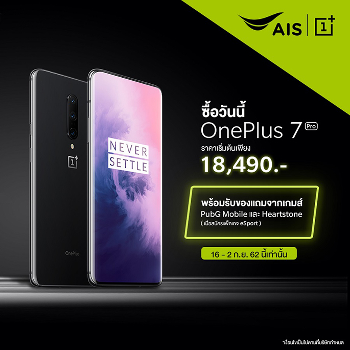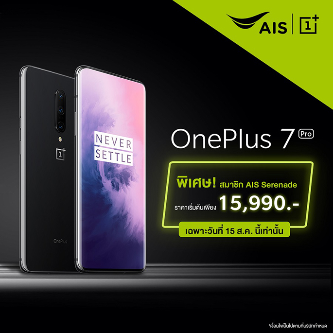 www.ais.co.th/serenade/smartphone และตั้งแต่ 16 สิงหาคม - 2 กันยายน 2562 พบกับโปรโมชั่น Hot Deal จาก AIS ให้คุณเป็นเจ้าของ OnePlus 7 Pro ได้ง่ายมากยิ่งขึ้น รับส่วนลดค่าเครื่องสูงสุด 7,000 บาท เมื่อสมัครแพ็กเกจรายเดือนเริ่มต้นที่ 649 บาทต่อเดือน ชำระค่าบริการล่วงหน้า 1,000 บาท