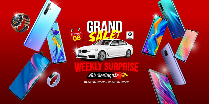 HUAWEI Grand Sale 2019 โปรโมชั่นสุดยิ่งใหญ่จาก หัวเว่ย ที่จัดให้อย่างจุใจตลอด 2 เดือนเต็ม ตั้งแต่ปลายเดือนมิถุนายนที่ผ่านมา ปีนี้จัดหนักจัดเต็มกว่าเดิม โดยขนทัพสมาร์ทโฟน แท็บเล็ต และแก็ดเจ็ตหัวเว่ยเกือบทุกรุ่นมาร่วมรายการในราคาพิเศษ พร้อมของสมนาคุณสุดพรีเมียม พร้อมรับสิทธิ์ผ่อน 0% นานสูงสุด 36 เดือน และลุ้นเป็นเจ้าของรถยนต์สุดหรู "BMW 520d M Sport" มูลค่ากว่า 3.5 ล้านบาท