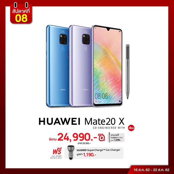 HUAWEI Mate20 X ร่วมโปรโมชั่นแกรนด์เซลในราคาพิเศษ 24,990 บาท (จากราคาปกติ 28,990 บาท) ฟรีทันที HUAWEI M-PEN มูลค่า 1,090 บาท พร้อมผ่อนชำระ 0% และรับของสมนาคุณ HUAWEI SuperCharge Car Charger มูลค่า 1,190 บาท