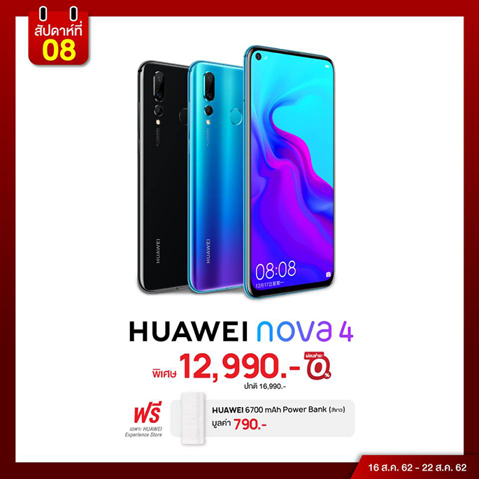 HUAWEI nova4 ร่วมจัดโปรโมชั่นแกรนด์เซลในราคาพิเศษ 12,990 บาท (จากราคาปกติ 16,990 บาท) พร้อมผ่อนชำระ 0% และรับ HUAWEI 6700 mAh Power Bank มูลค่า 790 บาทฟรีทันที