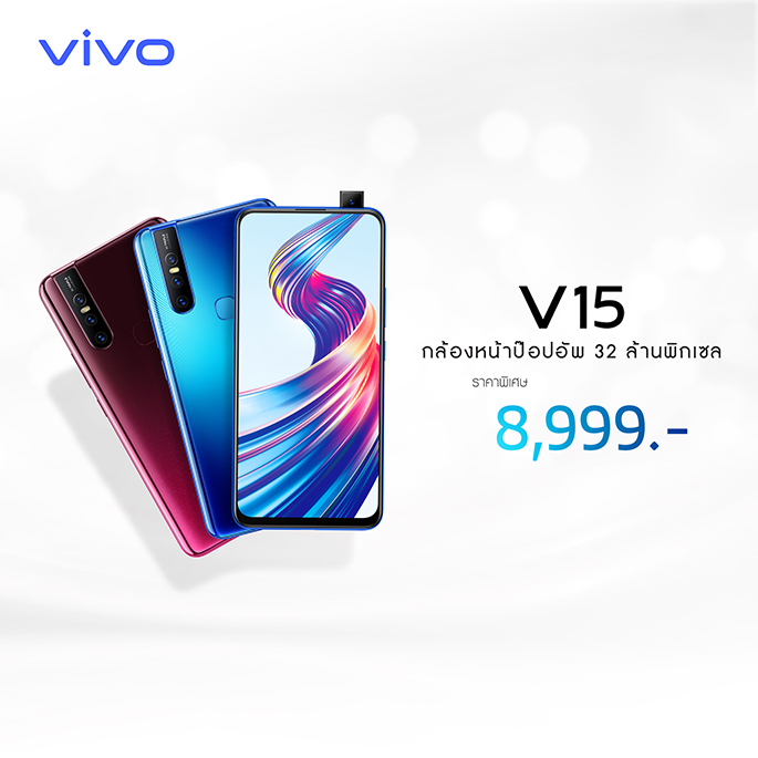 Vivo V15 ที่มาพร้อมกับหน่วยประมวลผล MTK Helio P70 หน่วยความจำ RAM 6 GB + ROM 128 GB หน้าจอแบบ Ultra FullView Display หน้าจอไร้ขอบที่แท้จริง หน้าจอชนิด LPS - LCD 24-bit ขนาด 6.53 นิ้ว อัตราส่วน 19.5:9 กล้องหน้า Pop Up ความละเอียด 32MP ผู้นำทางด้านการถ่ายภาพของวงการสมาร์ทโฟน กล้องหลังมาพร้อมเลนส์ความละเอียด 12MP (24 Million Photosensitive Units + 8MP AI Super Wide-angle Camera + 5MP Depth Camera มีทั้งหมด 2 สี คือ สี Topaz Blue (น้ำเงิน-ฟ้า) และสี Glamour Red (แดง) วางจำหน่ายในราคาเปิดตัว 10,999 บาท ปรับเหลือที่เพียง 8,999 บาทเท่านั้น