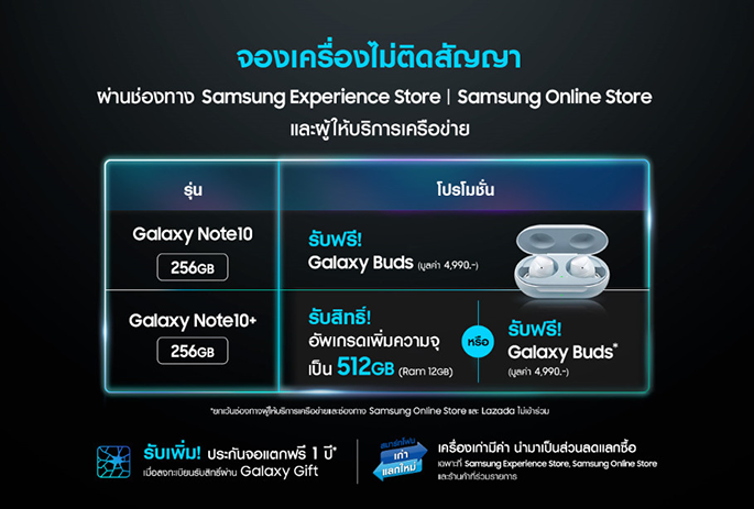 Samsung Galaxy Note 10+ ก็จะสิ้นสุดลงในวันที่ 23 สิงหาคม 2562 นี้ ใครที่สนใจรีบ ๆ กันนิด เวลาเหลือไม่มากแล้ว กับโปรโมชั่นสุดคุ้ม!!! เริ่มต้นเพียง 15,900 บาท พร้อมรับสิทธิ์ประกันจอแตกนาน 1 ปี เมื่อจองผ่านผู้ให้บริการเครือข่าย และสามารถเลือกเพิ่มความจุเป็น 512 GB หรือเลือกรับหูฟังไร้สาย Galaxy Buds มูลค่า 4,990 บาท ฟรี! พร้อมรับสิทธิ์ประกันจอแตกนาน 1 ปี เมื่อจองผ่าน Samsung Brand Shop เว็บไซต์