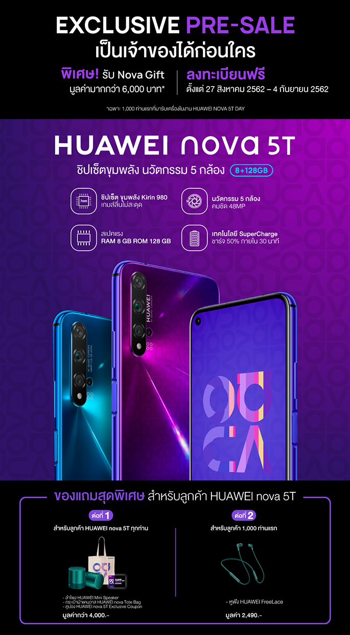จอง HUAWEI nova 5T ตั้งแต่ 27 สิงหาคม - 4 กันยายนนี้ นอกจากจะได้รับเครื่องก่อนใครในประเทศไทยแล้ว 1,000 ท่านแรกที่ลงทะเบียนจองสิทธิ์การซื้อและมารับโทรศัพท์ภายในงาน HUAWEI nova 5T Day Exclusive Pre-Sale ณ ลานทางเชื่อม BTS Siam Square One ในวันที่ 15 กันยายน 2562 เวลา 10.00 - 20.00 น. จะได้รับ nova Gift สุดพิเศษ ประกอบด้วย ลำโพงคู่ HUAWEI Mini Speaker, หูฟัง HUAWEI FreeLace และคูปองส่วนลดต่างๆ จาก nova 5T รวมมูลค่ากว่า 6,000 บาท