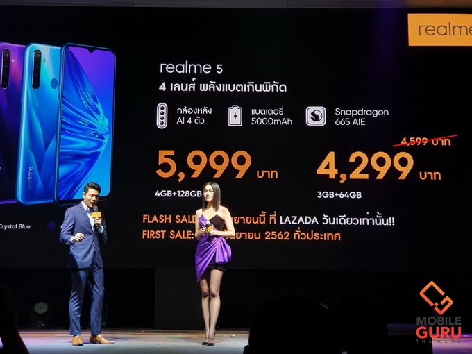 - realme 5 ความจุ 4/128 ราคา 5,999 บาท 3/64 ราคา 4,599 บาท พิเศษ Lazada วางจำหน่ายราคาพิเศษเหลือเพียง 4,299 บาทเท่านั้น เฉพาะในวันที่ 19 ก.ย. 62 วันเดียวเท่านั้น วางจำหน่ายจริง 21 ก.ย. 62