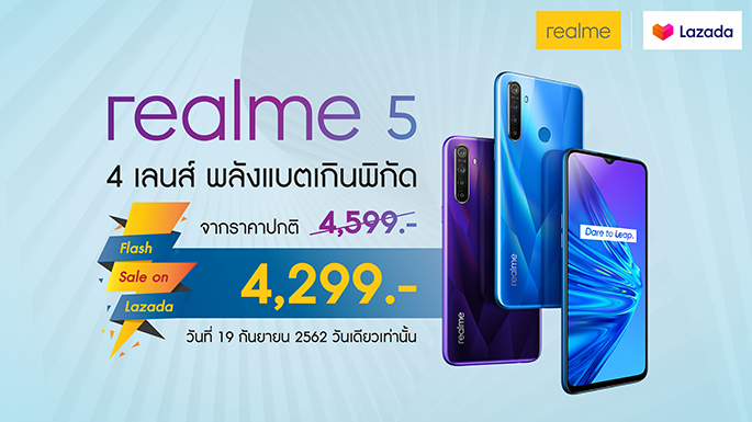 realme ใจดี จัด Flash Sale สมาร์ทโฟน realme 5 บน Lazada ราคาเพียง 4,299.- รีบด่วน วันเดียวเท่านั้น!!