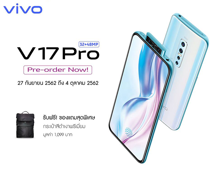 - สำหรับผู้ที่ทำการจอง Vivo V17 Pro สามารถรับเครื่องพร้อมของแถมในวันที่ 5 ตุลาคม 2562 เป็นต้นไป