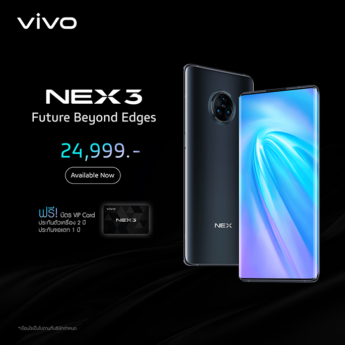 Vivo NEX 3 วางจำหน่ายแล้ววันนี้ โดยมีให้เลือกเพียง 1 สี คือ สีดำ Glowing Night ในราคา 24,999 บาท สามารถซื้อได้ที่ตัวแทนจำหน่าย AIS, Truemove H, DTAC และตัวแทนจำหน่ายชั้นนำทั่วประเทศ หากสนใจซื้อผ่านออนไลน์สามารถสั่งซื้อได้ที่ LAZADA :