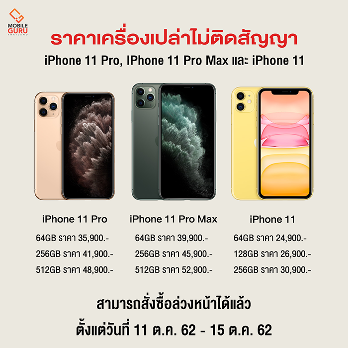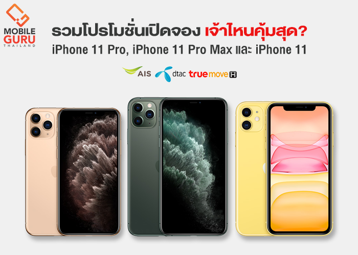 iPhone 11 Pro, iPhone 11 Pro Max และ iPhone 11 สมาร์ทโฟนรุ่นใหม่ของ Apple เปิดให้สั่งจองล่วงหน้าได้แล้วตั้งแต่วันที่ 11 ต.ค. 2562 เวลา 00:01 น. - 15 ต.ค. 2562 เวลา 12:00 น. แต่ละเครือข่ายต่างจัดโปรโมชั่นสุดพิเศษเพื่อเอาใจสาวกแอปเปิ้ลโดยเฉพาะ ไม่ว่าจะเป็นผ่อน 0% ได้นานสูงสุด 48 เดือน กับบัตรเครดิตที่ร่วมรายการ หรือรับส่วนลดได้ทันทีโดยที่ไม่ต้องจ่ายค่าบริการล่วงหน้า ก่อนที่จะตัดสินใจสั่งซื้อล่วงหน้า เรามาดูกันดีกว่าว่า เอไอเอส, ดีแทค และ ทรูมูฟ เอช แต่เจ้าจัดโปรโมชั่นอะไรได้โดนใจกันบ้าง