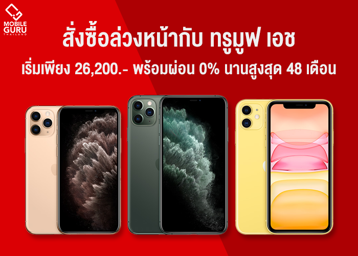 สั่งซื้อ iPhone 11 Pro Max, iPhone 11 Pro และ iPhone 11 กับ ทรูมูฟ เอช ระหว่างวันที่ 11 ตุลาคม 2019 - 17 ตุลาคม 2019 ค่ามัดจำ 5,350 บาท ในราคาเริ่มต้นเพียง 26,200 บาท พร้อมผ่อน 0% นานสูงสุด 48 เดือน