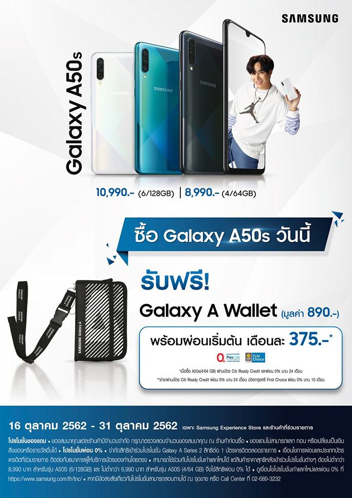 Galaxy A50s รุ่นใดก็ได้วันนี้ รับฟรี! Galaxy A Wallet สุดเท่ มูลค่า 890 บาท และโปรผ่อนแรงแห่งปี เริ่มต้นเพียง 375 บาทต่อเดือน เมื่อซื้อ