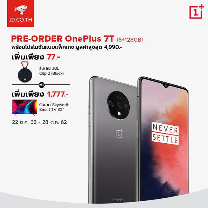 - เมื่อสั่งจอง OnePlus 7T เพิ่มเงินเพียงแค่ 77 บาท รับฟรี! ลำโพง JBL Clip 2 มูลค่า 990 บาท
