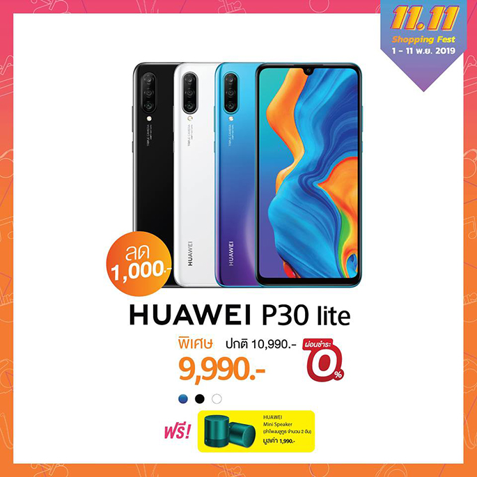 - HUAWEI P30 Lite สมาร์ทโฟนน้องเล็กในตระกูล P Series ราคาสุดคุ้ม กับกล้องหลังสามตัวและกล้องหน้าจัดเต็ม 32 ล้านพิกเซล เอาใจสายเซลฟี่ที่แท้จริง ถ่ายสวยคมชัดทุกองศา กับราคาสุดพิเศษ 9,990 บาท พร้อมรับฟรีทันที HUAWEI Mini Bluetooth Speaker แบบ Double Set (1 คู่) มูลค่า 1,990 บาท