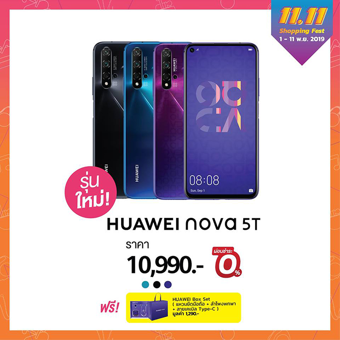- HUAWEI nova 5T สมาร์ทโฟนสเปคแน่นรุ่นใหม่ล่าสุดที่เพิ่งเปิดตัวในไทยและได้รับการตอบรับอย่างดีเยี่ยม มาพร้อมขุมพลังแฟลกชิป นวัตกรรม 5 กล้อง และดีไซน์สดใสไม่ซ้ำใคร ในราคาเพียง 10,990 บาท พร้อมรับของสมนาคุณ HUAWEI Box Set มูลค่า 1,290 บาท