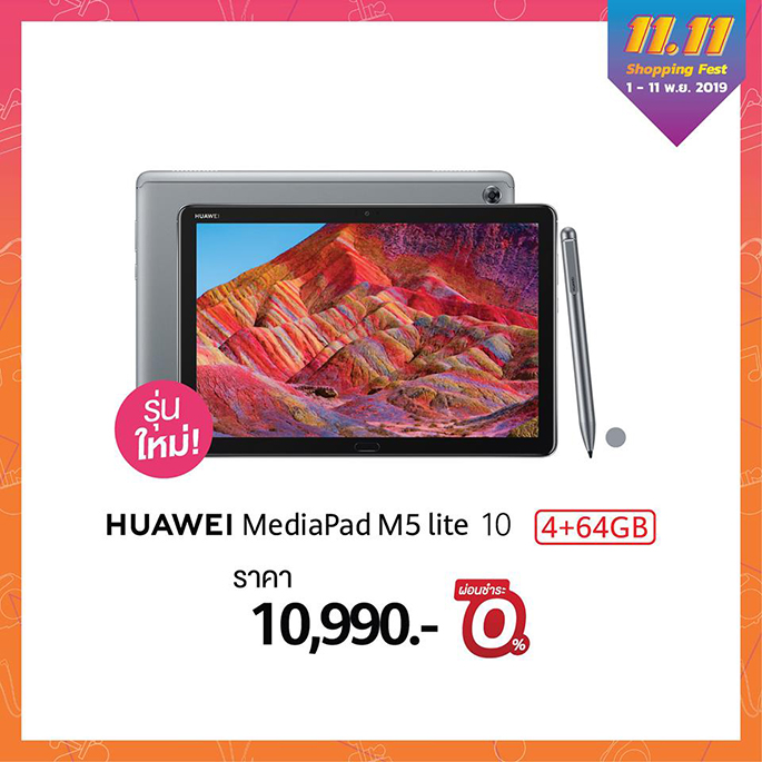 - HUAWEI MediaPad M5 lite 10 (4 + 64 Gb) รุ่นใหม่ล่าสุดในซีรีส์ Media Pad แท็บเล็ตเพรียวบางหน้าจอ Full HD 10.1 นิ้ว ทำงานด้วยระบบ Octa-Core processor ให้เสียงกระหึ่มด้วยลำโพงคู่จาก Harman Kardon ครบครันด้วยกล้องหน้าและกล้องหลังความละเอียด 8MP ชาร์จได้รวดเร็วด้วยระบบ Quick Charge มาพร้อมปากกา M-Pen Lite ในราคา 10,990 บาท