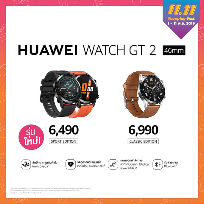 พิเศษสุด ในเดือนพฤศจิกายน พบแกดเจ็ตสุดฮอตที่เพิ่งเปิดตัว HUAWEI Watch GT 2 สมาร์ทวอชขนาด 46" ซีรีส์ใหม่ล่าสุดที่เพิ่งวางจำหน่ายในไทยอย่างเป็นทางการเมื่อเร็วๆ นี้ ซึ่งโดดเด่นด้วยดีไซน์เรียบหรูที่มาพร้อมประสิทธิภาพอัดแน่น ด้วยชิปเซ็ตแบบ Kirin A1 สามารถใช้งานได้ยาวนาน พร้อมฟีเจอร์วัดอัตราการเต้นของหัวใจได้อย่างแม่นยำแม้ในขณะว่ายน้ำ และโหมดออกกำลังกายแบบจัดเต็ม ทั้งปีนเขา ไตรกีฬาและอื่นๆ รวมทั้งยังสามารถรับสายผ่าน Bluetooth ได้อีกด้วย โดย Classic Edition มาในราคาพิเศษเพียง 6,990 บาท และ Sport Edition ในราคา 6,490 บาท