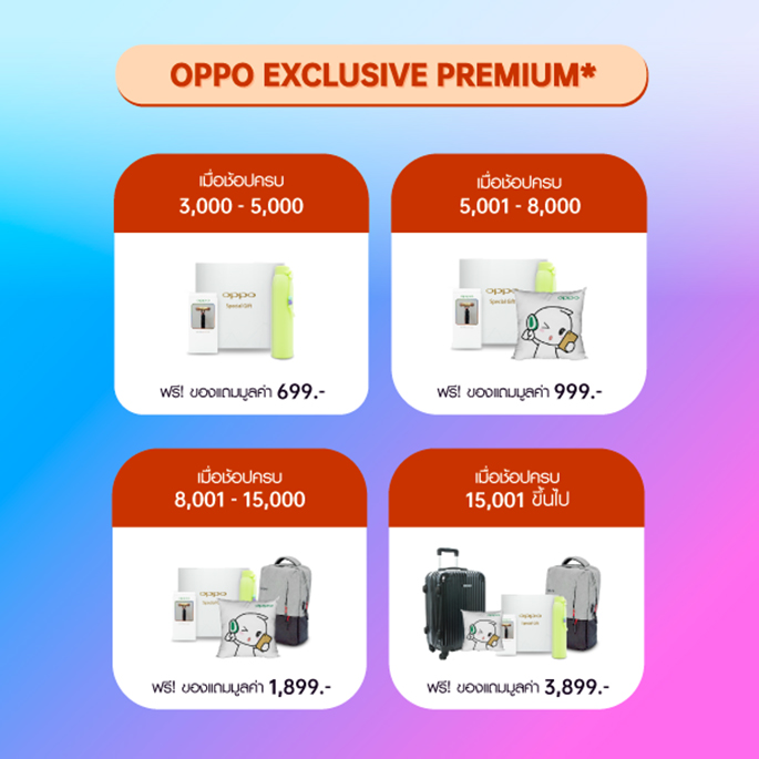 ลดแล้วยังได้ของพรีเมี่ยมเพิ่มอีก เพียงช้อปสินค้า OPPO ครบตามยอดที่กำหนด (หลังหักส่วนลด) รับฟรีของพรีเมี่ยมสุดพิเศษมูลค่าสูงสุดถึง 3,899.- เฉพาะช้อปผ่าน OPPO Official Store ที่ Lazada, Shopee และ JD Central เท่านั้น