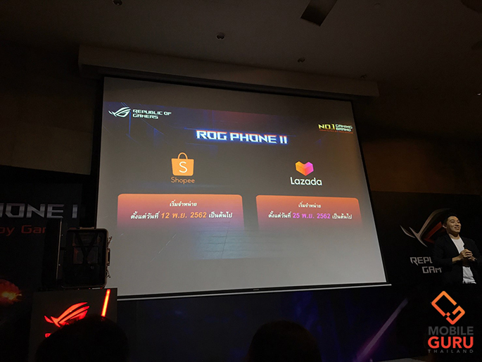 เริ่มวางจำหน่ายผ่าน Lazada ตั้งแต่วันที่ 25 พ.ย. 2019 เป็นต้นไป พร้อมโปรโมชั่นพิเศษสำหรับอุปกรณ์เสริมเมื่อสั่งซื้อ ROG Phone II (ราคา 29,990 บาท ) ดังนี้