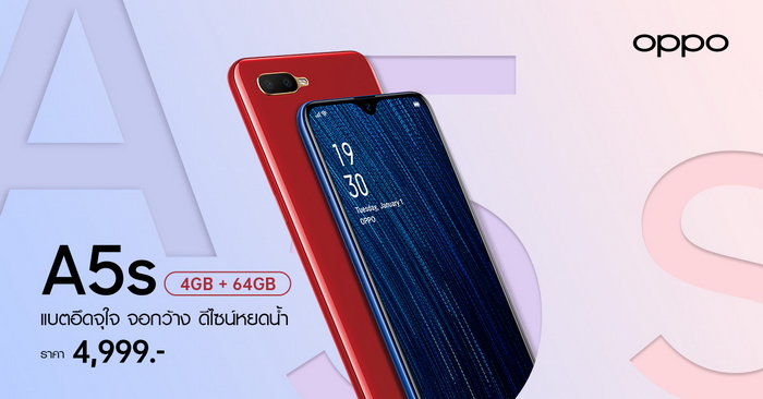 OPPO A5s RAM 4GB/ROM 64GB มีให้เลือก 2 สี คือ สีแดงและสีน้ำเงิน พร้อมวางจำหน่ายวันที่ 15 พฤศจิกายนนี้ ในราคาเพียง 4,999 บาท ผู้ที่สนใจสามารถหาซื้อได้ที่ OPPO Brand Shop ทุกสาขาและตัวแทนจำหน่ายที่ร่วมรายการ