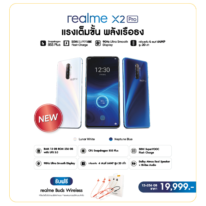 - เมื่อซื้อ realme X2 Pro "แรงเต็มขั้น พลังเรือธง" ราคาเริ่มต้นที่ 19,999 บาท รับฟรีทันทีหูฟัง realme Buds Wireless มูลค่า 1,999 บาท พร้อมการรับประกันตัวเครื่องนาน 24 เดือน และสิทธิ์การผ่อนชำระทางบัตรเครดิตที่ร่วมรายการ 0% นานสูงสุด 24 เดือน