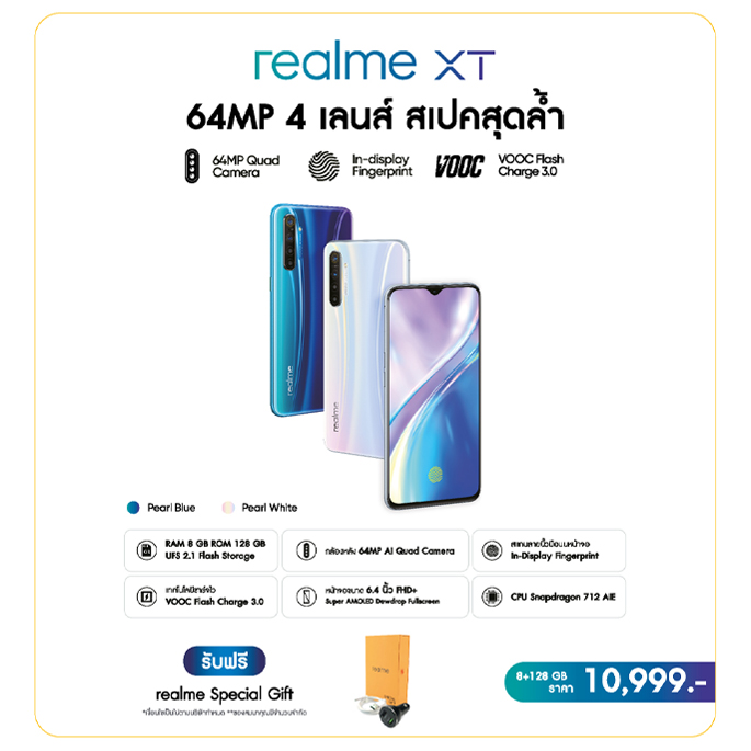 - เมื่อซื้อ realme XT "64MP 4เลนส์ สเปคสุดล้ำ" ราคาเริ่มต้นที่ 10,999 บาท รับฟรีทันที ชุดของขวัญ realme Special Gift พร้อมการรับประกันตัวเครื่องนาน 24 เดือน และสิทธิ์การผ่อนชำระทางบัตรเครดิตที่ร่วมรายการ 0% นานสูงสุด 10 เดือน