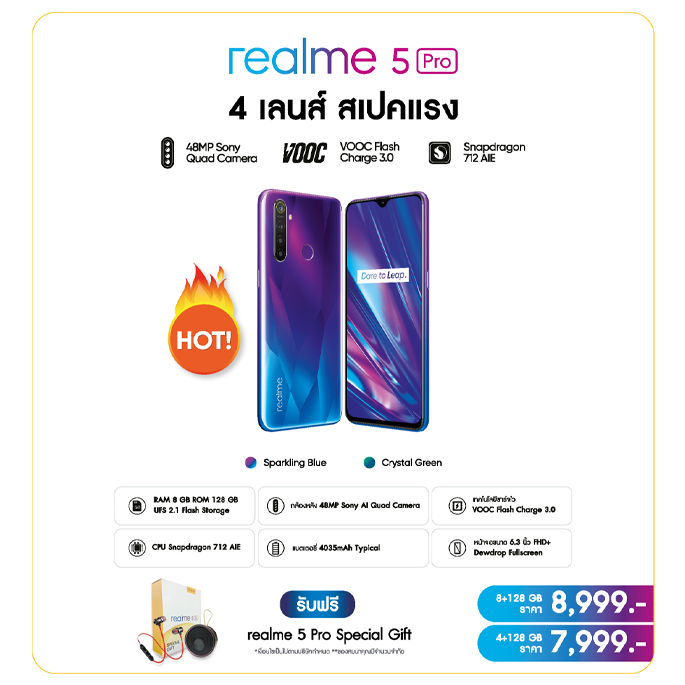 - เมื่อซื้อ realme 5 Pro "4 เลนส์ สเปคแรง" ราคาเริ่มต้นที่ 7,999 บาท รับฟรีทันทีชุดของขวัญ realme 5 Pro Special Gift พร้อมการรับประกันตัวเครื่องนาน 24 เดือน และสิทธิ์การผ่อนชำระทางบัตรเครดิตที่ร่วมรายการ 0% นาน 6 เดือน