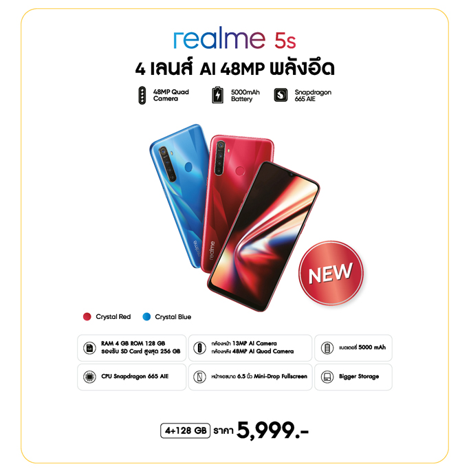 นอกจากนี้ realme ยังประกาศการวางจำหน่าย realme 5s "4 เลนส์ AI 48MP พลังอึด" ในราคาเริ่มต้นที่ 5,999 บาท พิเศษ! ลูกค้าสามารถจับจองเป็นเจ้าของ realme 5s ในราคาพิเศษ Flash Sale ทางช่องทาง Lazada ในวันที่ 4 ธันวาคม เฉพาะช่วงเวลา 10.00 - 14.00 น. ก่อนจะวางจำหน่ายพร้อมกันทุกช่องทาง ในวันที่ 7 ธันวาคมนี้